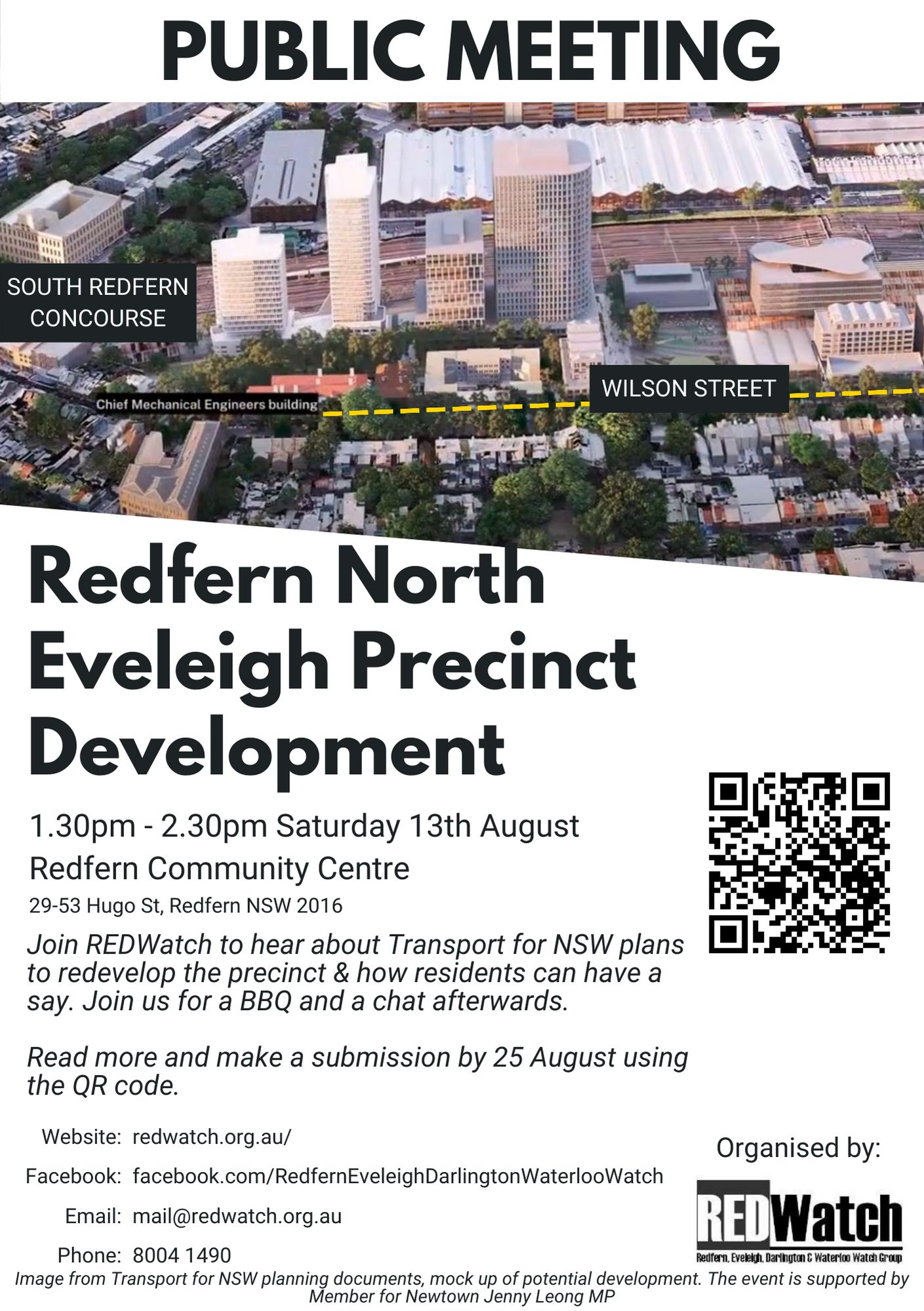 So join us for the public meeting between 1.30 and 2.30 followed by a BBQ until 3.30 at Redfern Community Centre 29-53 Hugo St, Redfern NSW 2016. You can download the event to your calendar in vCal<http://www.redwatch.org.au/Events/220813redwm/vcs_view> or iCal<http://www.redwatch.org.au/Events/220813redwm/ics_view> format. You can also download the poster for North Eveleigh Public Meeting<http://www.redwatch.org.au/eventnotice/220813redwp/download> to promote the event or share the event from the Facebook page<https://www.facebook.com/RedfernEveleighDarlingtonWaterlooWatch/>.