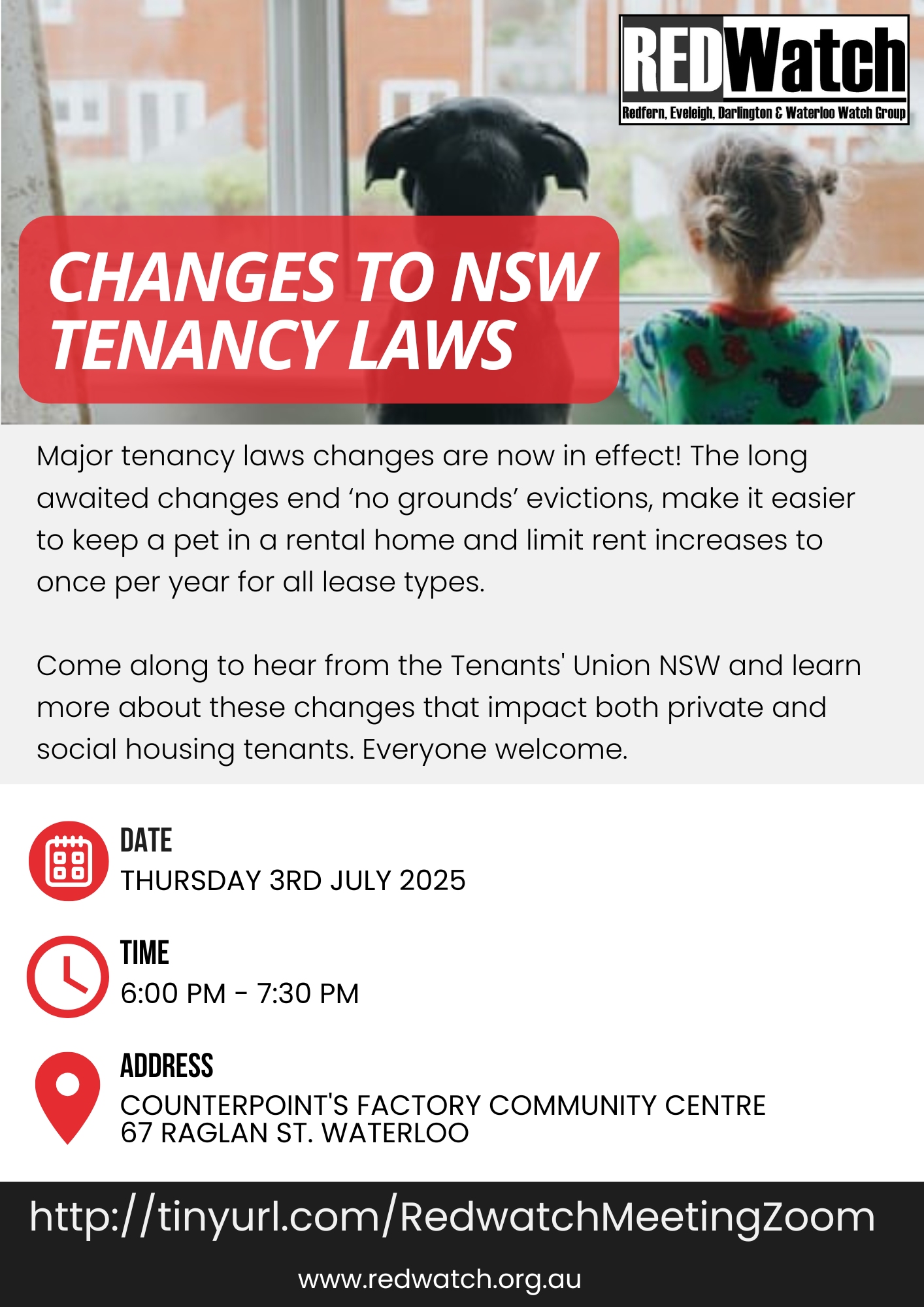 The Tenants' Union has been leading the push for these changes so come along to the REDWatch meeting on Thursday 3rd July to hear from the Tenants' Union NSW and learn more about these changes that impact both private and social housing tenants. Everyone welcome and bring your tenancy questions.