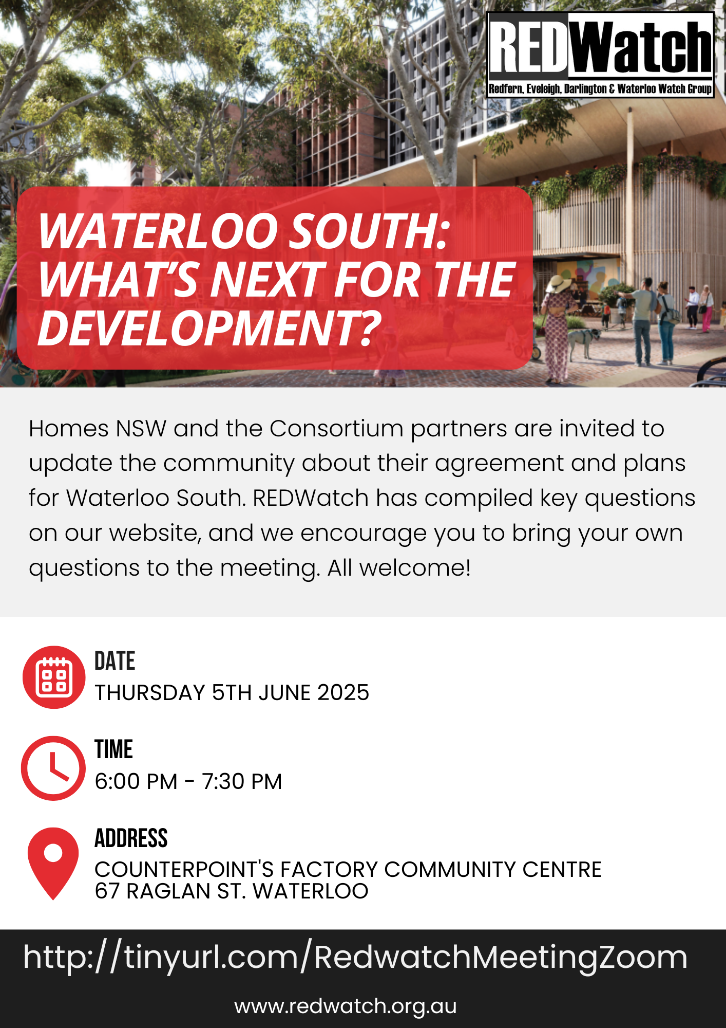 When the announcement of Homes NSW reaching agreement with The Stockland consortium was made back in early April, REDWatch issued an invitation to Homes NSW and the Consortium to present their plans to a REDWatch meeting on June 5th. So, to hear what they plan for Waterloo South, come along at 6pm on Thursday 5th June 2025 to Counterpoint's The Factory Community Centre, 67 Raglan Street, Waterloo or join us on line at by Zoom http://tinyurl.com/RedwatchMeetingZoom. You can promote this meeting with this flyer<http://www.redwatch.org.au/eventnotice/250605redwp>.